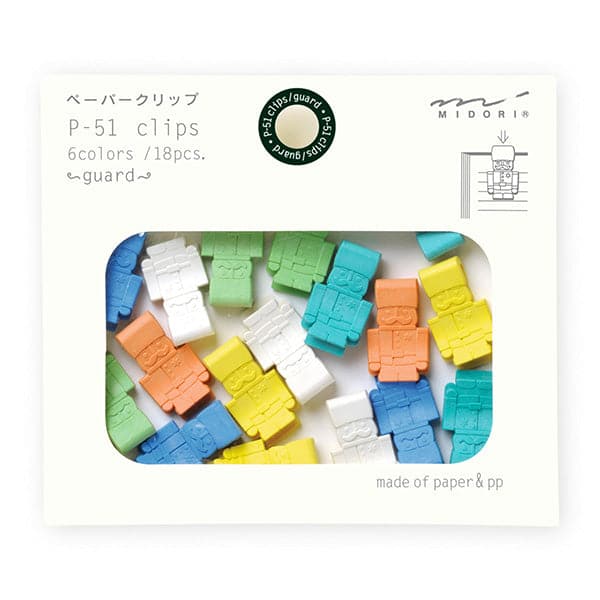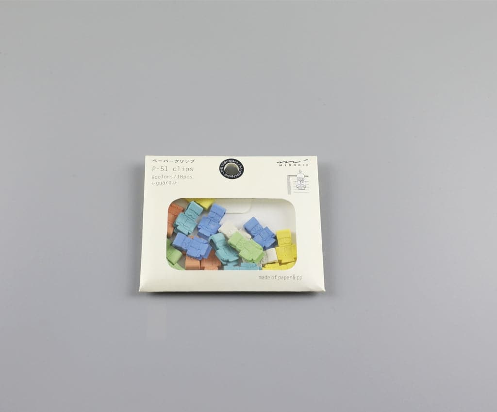 Fun assorted colours.// 18 clips in each package.// Each item holds together ~10 pages. Newest set of paper clips from Midori. This colourful package includes 18 pieces. Each item can clip together approximately 10 pages.