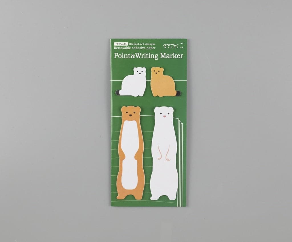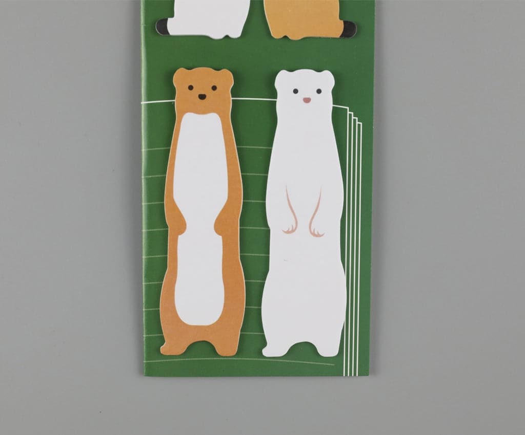 Cute and fun sticky labels Contains both Midori's Writing Markers and Point MarkersUse to annotate, mark or keep your page // 40 sticky labels per pack Set of weasel themed sticky labels from Midori. The cute little baby weasels are Point Markers, perfect for marking a point on a page, while the grown up weasels are Writing Markers, ideal for annotating or marking a page.
