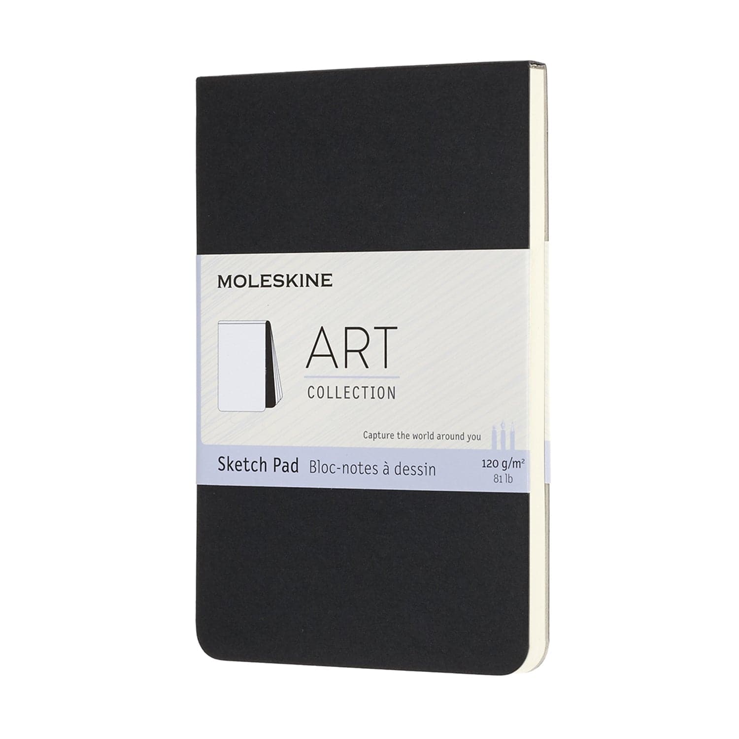 The Sketch Pad in classic black is a portable creative companion. 120 g/m_ ivory-colored pages invite you to keep your favorite artistic tools close at hand, ready to capture the world around you whenever inspiration strikes. Quality sketch-grade paper is the ideal base for a wide variety of creative media, from Moleskine Drawing Pencils to charcoal, fountain pens and markers, while the rigid back cover provides a solid surface to lean on when you are on the go. Cardboard cover Pocket size 9x14cm Large size 13x21cm Rounded corners Ivory-colored, 120 g/m_, acid-free paper Expandable inner pocket in the back Reusable paperband B-SIDE featuring additional printed tools Lies flat, opens at 180¡ All the pages of the Sketch Pad are detachable, making it easy for you to share, frame and organize your completed artwork.