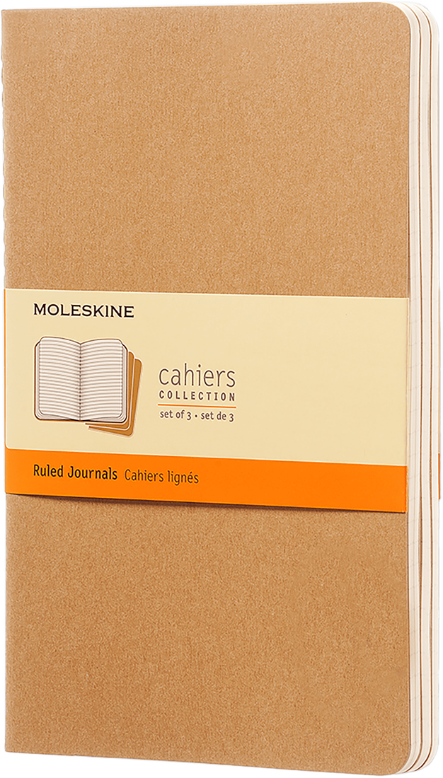 Pack of three large 13x21cm ruled kraft Cahiers with card covers and visible stitching on spine. Each Cahier is a slimline report-style notebook.The last 16 sheets are perforated for easy detachment, making it easy to share notes.