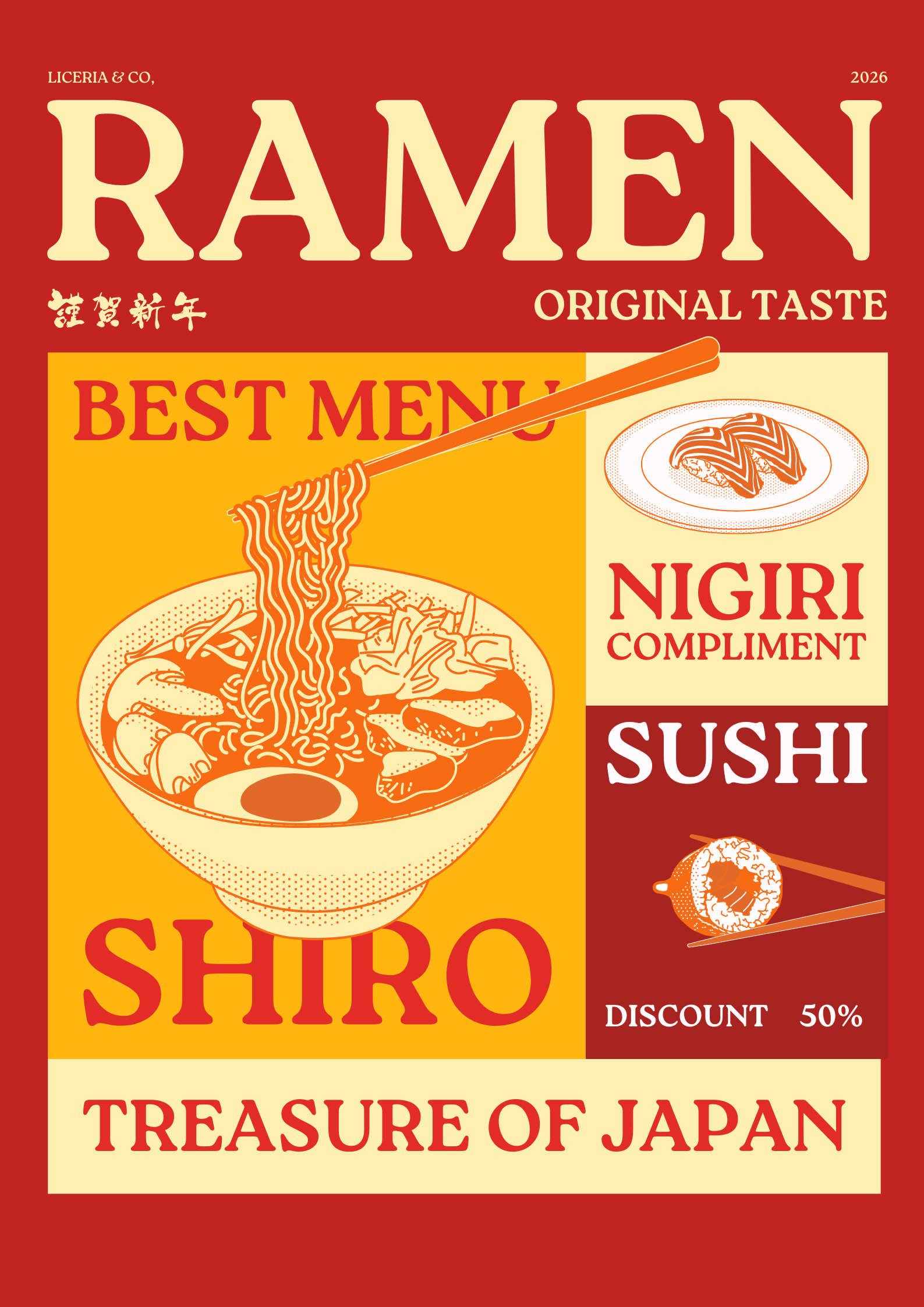 Inspired by vintage food ads and bold graphic design, the "Ramen" poster is a vibrant celebration of classic Japanese noodle culture with a retro twist. Part of our Modern Art collection, this A3 print blends playful and nostalgic colour palettes to create a standout piece for any wall.